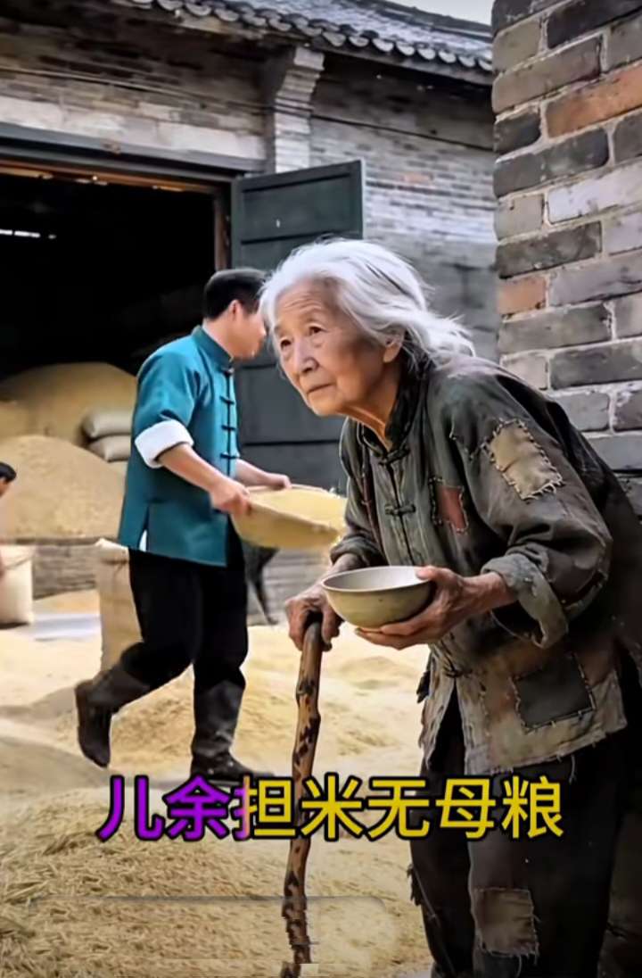 时光流转,画面陡转。粮仓满溢,谷物金黄,壮年的儿子端着簸箕,身影忙碌。而门边,白发苍苍的老母,手握空碗,倚杖而立,眼中是望不到尽头的期盼与寂寥。“儿余担米无母粮”,七个字,如冰锥刺骨,道尽了无私付出后最苍凉的现实。母亲可以饿着自己成全孩子,孩子却未必能在丰足时,想起回头为母亲盛满一碗饭。