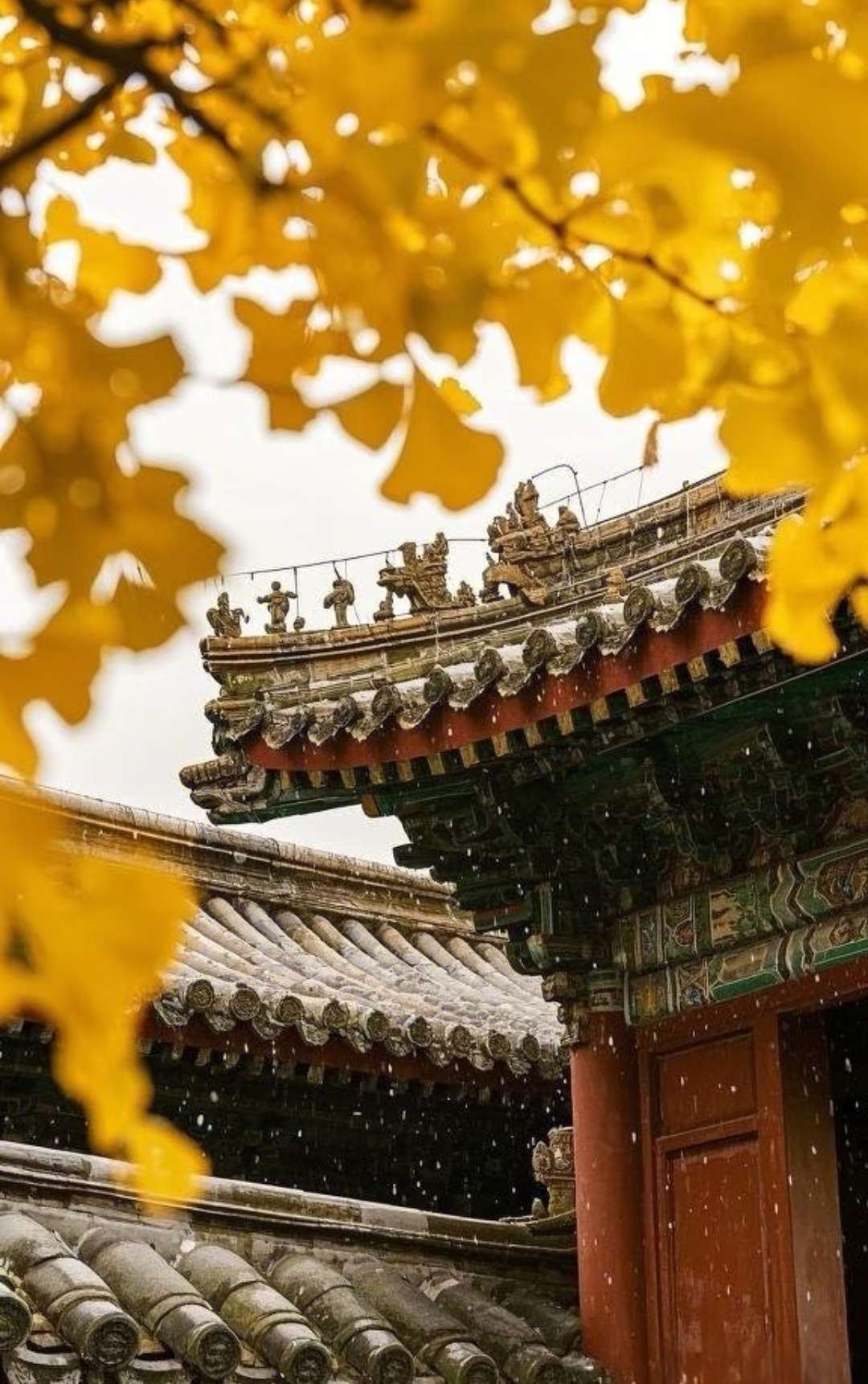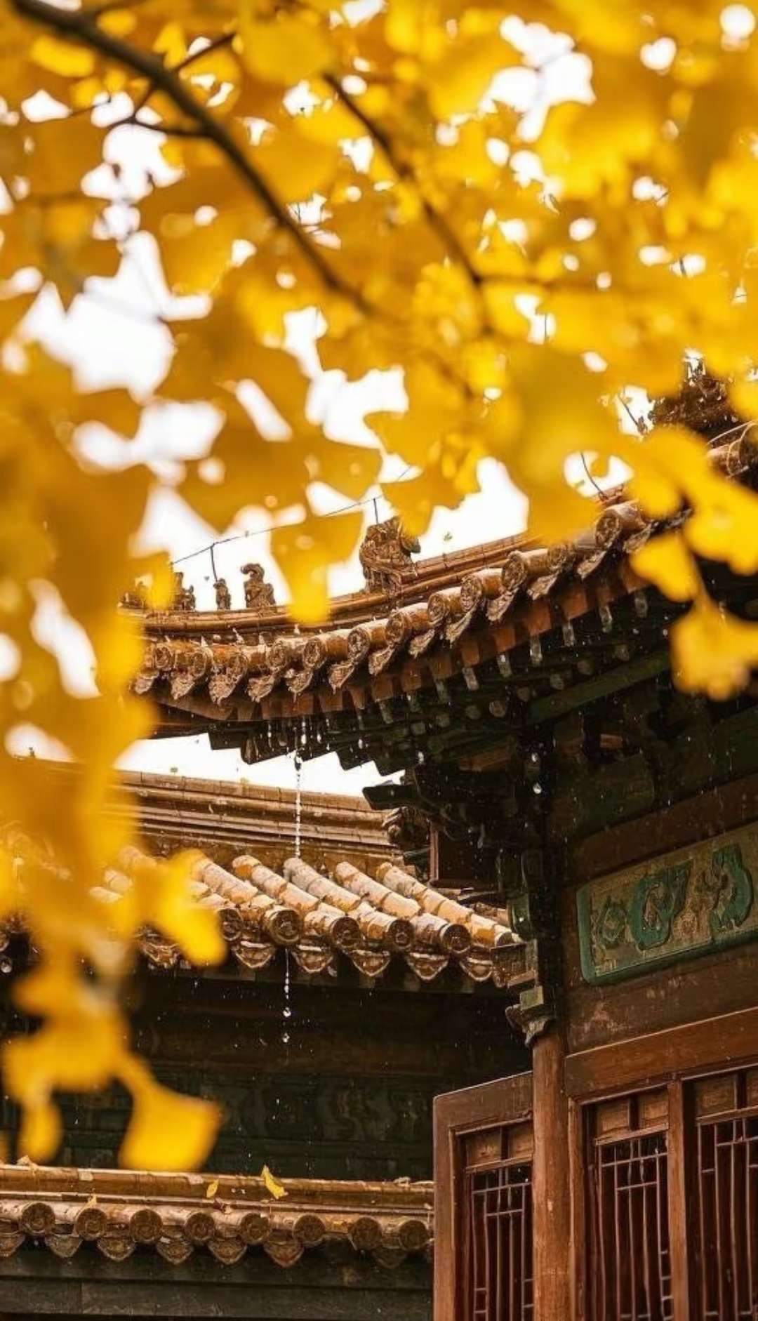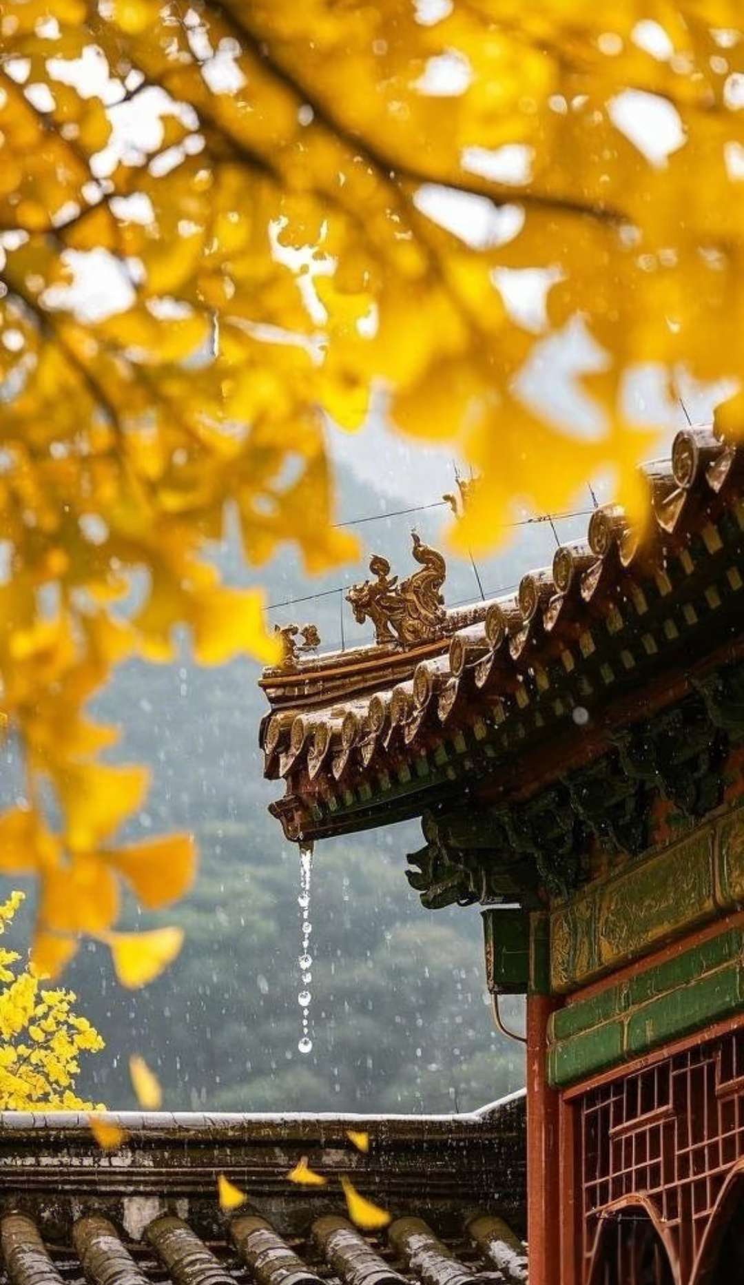 金叶垂檐染雨光,古楼叠瓦浸清霜。