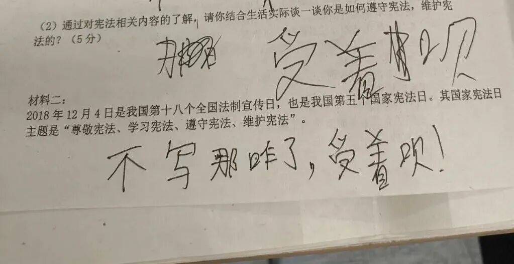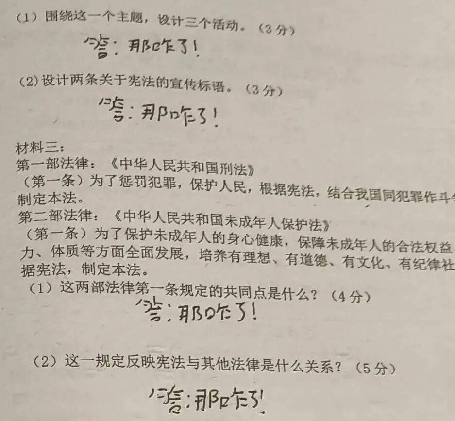 遇到不允许空着的大题,只写“解”字太窝囊,写“略”字又太敷衍,“那咋了”既凑了字数,又表明了态度,将它奉为所有试题的答案,再好不过。